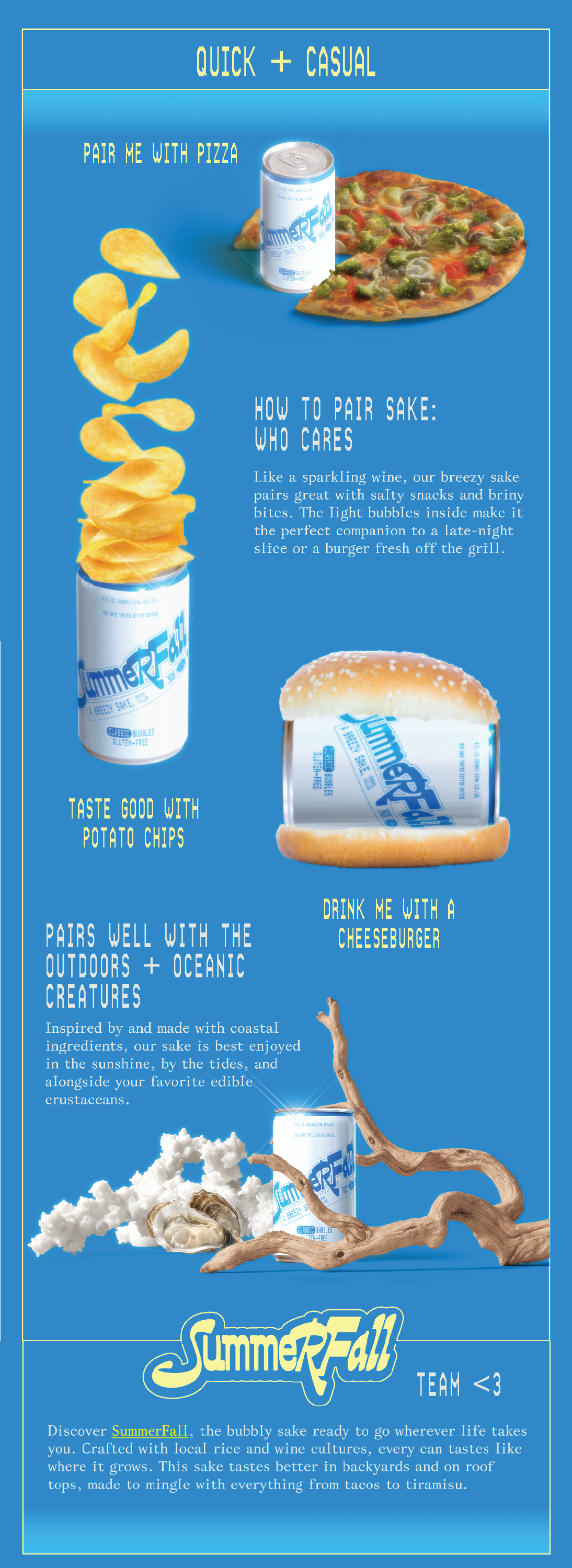 SummerFall set out to introduce sake to a new generation of drinkers in the U.S. by reframing it as an everyday beverage, not a niche ritual. To bring that vision to life, I directed our first lifestyle shoot in a casual home setting — friends gathered, pizza on the table, and sake in hand. The result was a visual identity that made sake feel familiar, fun, and refreshingly unpretentious.